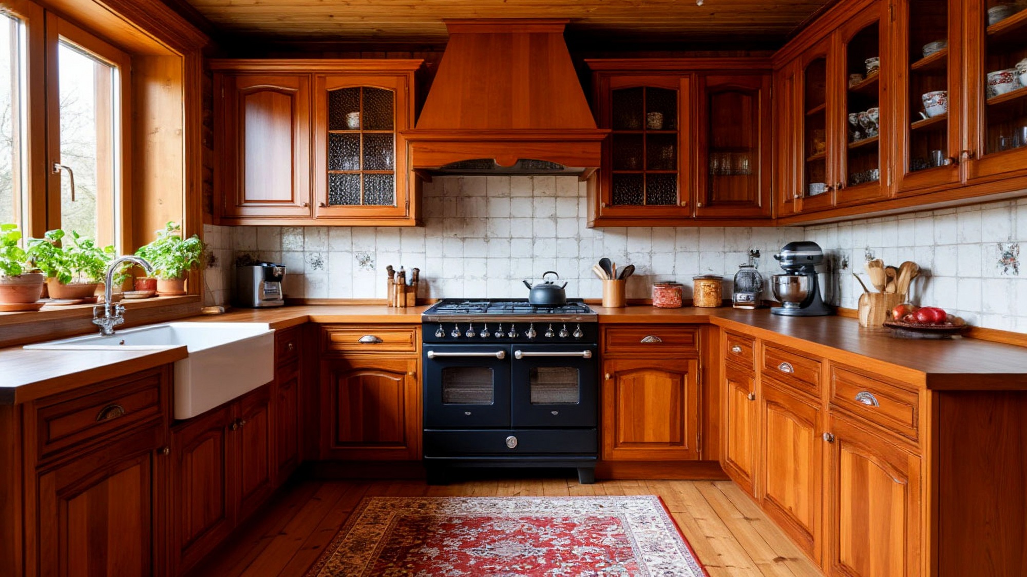 Фасад кухни выполнен из тщательно обработанного дерева с глубоким насыщенным коричневым оттенком, который подчеркивает текстуру натурального материала. Каждая деталь фасада — будь то филенка, резная рамка или декоративная планка — выполнена с высокой точностью, чтобы сохранить характерные черты русского стиля, при этом не перегружая пространство лишними элементами. Цвет коричневого дерева визуально согревает кухню, создаёт ощущение защиты и уюта, при этом прекрасно сочетается с другими элементами интерьера — светлыми стенами, натуральным камнем на столешнице и мягким текстилем.