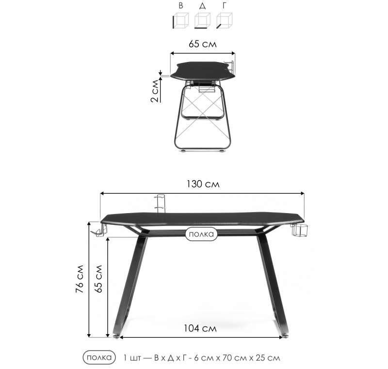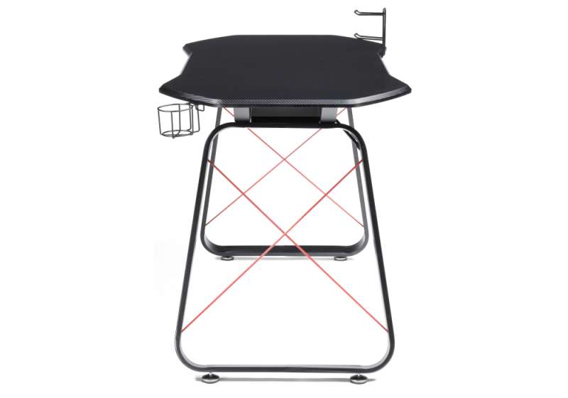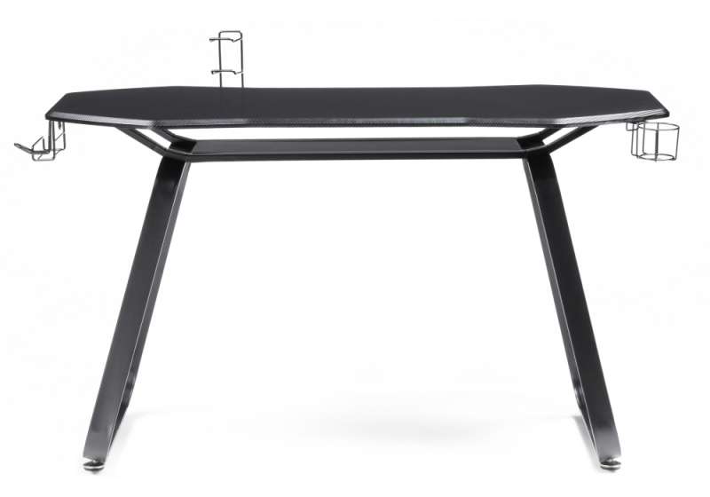 Поверхность столешницы покрыта пленкой под карбон. Стол оснащен подстаканником, крючком для наушников и универсальным держателем. Расстояние между ножками: 82 см. Высота до полки: 65 см. Высота от полки до столешницы: 6 см. Длина полки: 70 см. Глубина полки:25 см. Толщина столешницы: 2 см.